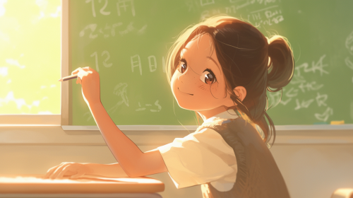 a 7-year-old Asian girl does subtraction problems on the chalkboard in her classroom, she is smiling, high-definition, anime style, --ar 16:9 --niji 6