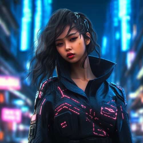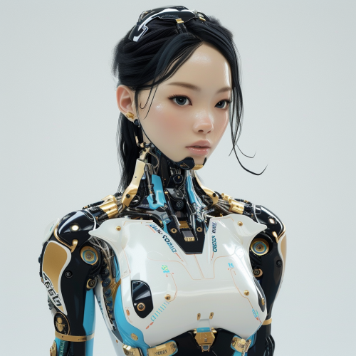 Futuristic Asian beautiful girl half human half robot, transition between human and technology is seamless, cool outfit with lots of technical details, whole head whole body, simple colors, blue, black, white and gold, super high detail. Full body is shown. --v 6.0
