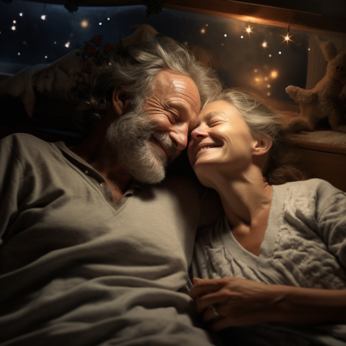 COUPLE 55 YEARS OLD SLEEPING WITH HAPPY FACIAL EXPRESSION IN A ROOM WITH CURRENT DECORATION AND 8K NIGHT LIGHTING
