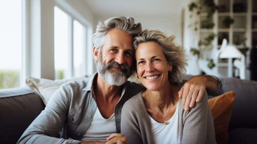 a very detailed image of a happy middle age couple sitting in a brightly lit living room with white walls, taken with a canon eos5 50mm f2.5 lens --ar 16:9
