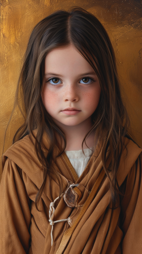 a 6 year old brunette girl hyperrealistic portrait. She is wearing Jedi clothes, 100% full front view, eyes staring completely to the front. Gold and brown color background. --ar 9:16 --v 6.0