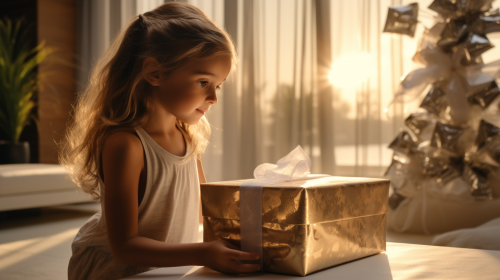 A little girl is opening the gift box in living room, i see the couch, long-distance photo, extreme detail, 8k photorealistic, Canon 5d, --ar 16:9 --s 250