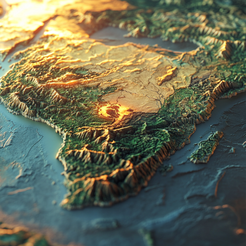 a highly detailed, cinematic photograph of the African continent's 3D topographic map, with Tanzania bursting out of the surface, prominently centered and illuminated, while the surrounding countries subtly fade into the background, evoking a sense of depth and dimensionality, captured with a shallow depth of field,
