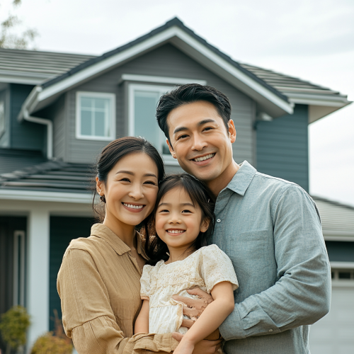 realistic photo, There are three families, father, mother, and a girl who are happy in front of the house. The house is a two-story western house, and the ages of mom and dad are Asians in their late 20s and early 30s
