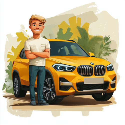 funny charicature style t-shirt print design about a young blonde skinny guy with biiig smile, posing next to his yellow BMW X1 car, showing everything is OK, colorful cartoon character, a driving teacher proud of his car --s 750