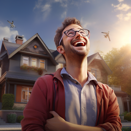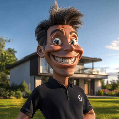heat pump engineer wearing black polo shirt is photoshopped to look like a caricature. With a huge smile and puffy cheeks and a big head. In the background you can see a beautiful, modern house. sunny weather, tree shadows, 8k, photography, photoshop --v 6.1 --ar 1:1 --s 80