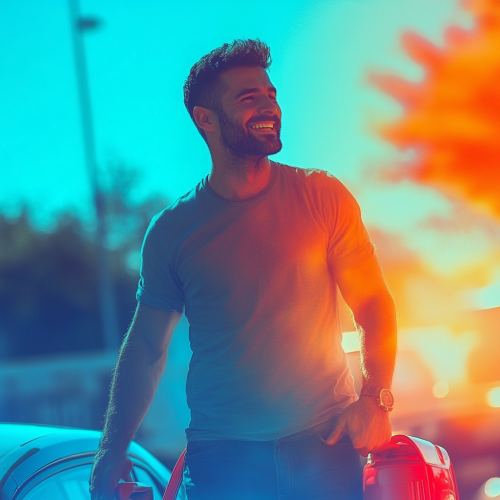 blurry image of a happy man next to a car during a summer day with a red vacuum cleaner. The overlay of this image is blue. There are vibrant light elements in this image