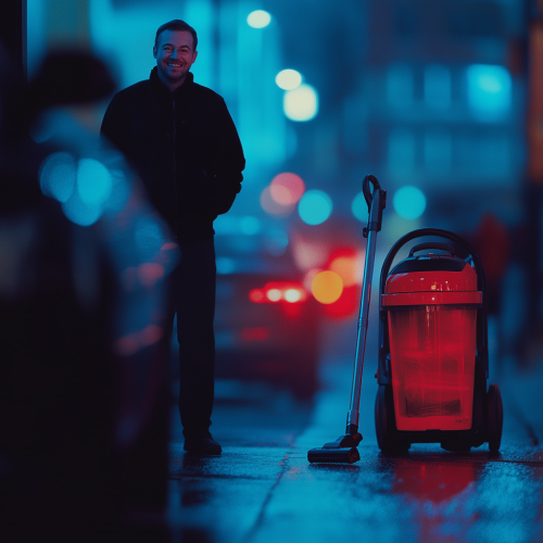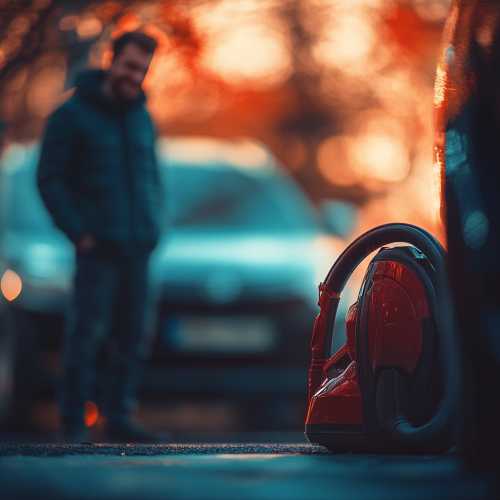 blurry image of a happy man next to a car during a summer day. In the fokus of the image is a red vacuum cleaner. The overlay of this image is blue. There are vibrant light on the right frame side