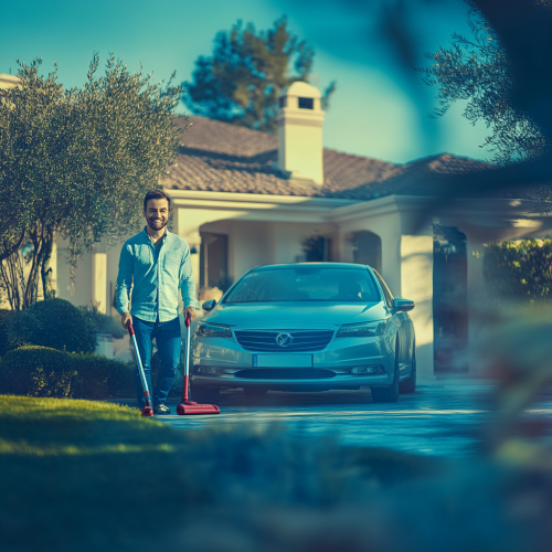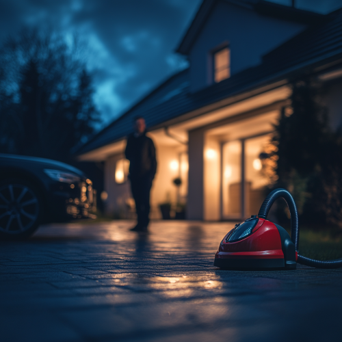 light blurry image of a happy man next to a car in front of a nice house. In the fokus of the image is a red vacuum cleaner. The overlay of this image is light dark blue.