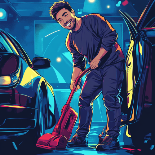 happy man in fron of a car with opened doors with a red vacuum cleaner. The overlay of this image is blue. There are vibrant light elements in this image. Comic like illustration