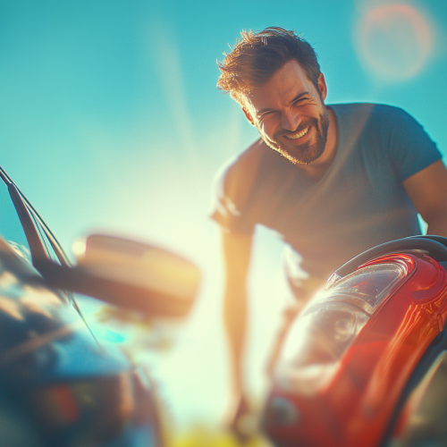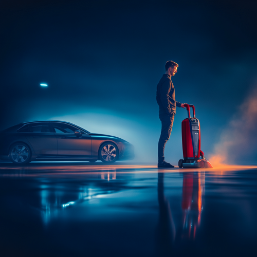 light blurry image of a happy man next to a car during a nice day. In the fokus of the image is a red vacuum cleaner. The overlay of this image is dark blue. There are vibrant light elements in this image