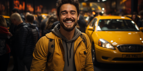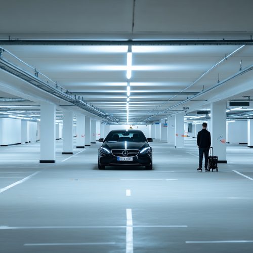 Location: Underground parking lot. The space should be clean, modern and well lit. The ceiling is visible, with lighting elements such as lamps or LEDs that create uniform lighting. The parking lot should be spacious with visible markings for parking spaces. 2. Car: In the center of the frame is a modern car. You can choose colors that contrast with the general background of the parking lot to attract attention. 3. Man: A young or middle-aged man in comfortable clothes, for example, in a tracksuit or casual clothes. He may look happy or satisfied.5. Additional details: You can add elements that emphasize the comfort and safety of parking, such as clearly marked parking spaces or viewing mirrors. Additional paraphernalia, for example, a dog basket or car accessories, is suitable. 6. Atmosphere: The overall appearance of the scene should be positive and comfortable to reflect the convenience of underground parking for users--s 600