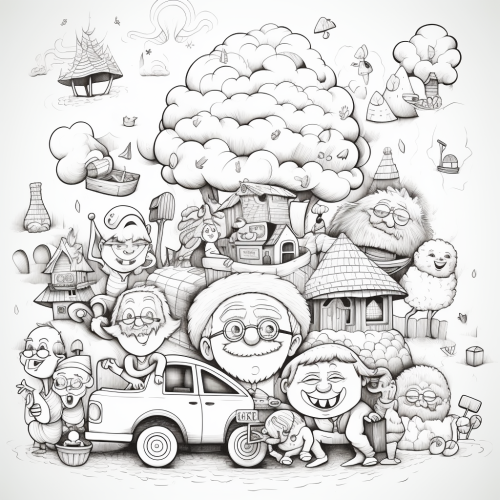 illustration of a crowded family, old man, old woman, happy people, laughing, hugging each other, children playing, wooden village house, a car, trees, mountains, clouds, sketch, black and white style, lines and dots, cartoon style, thin lines