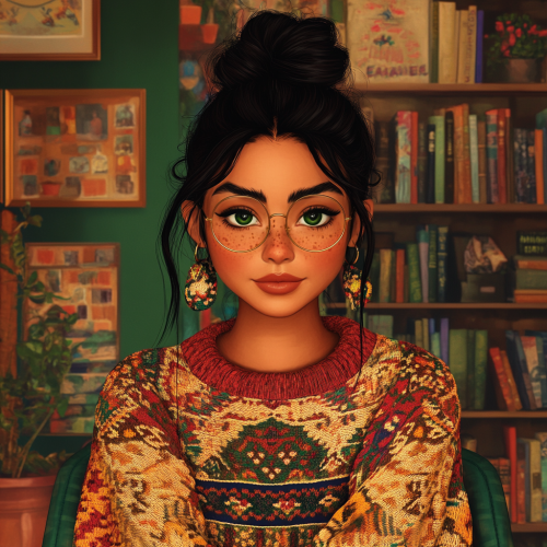 a mexican woman around 20 years old, with chocolate hair in a messy bun, round face, mossy green eyes, round glasses, dressed colorful sitting in a small library