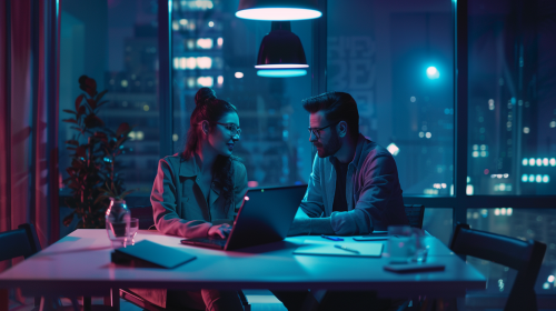 lifelike hero image for an IT consulting company, man and woman working together at a table --ar 16:9