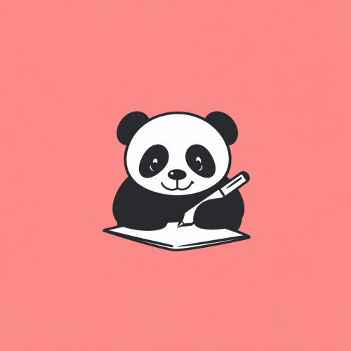 Logo in a minimalist style, featuring a shape with a happy cute panda holding an ink fountain pen. The background is a solid color. The design is created using vector graphics, with simple shapes and lines, no shadows or gradients, and a combination of black and gray colors, resulting in a modern and professional-looking design. --v 6.1