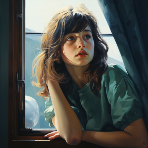 Image of a person standing at a window looking out of the house: Image of a person standing looking out at the sky and the big city from a window with raindrops. The water drops give the image a lonely look, expressing the longing for home and the missing warmth, realistic. ar 9:16