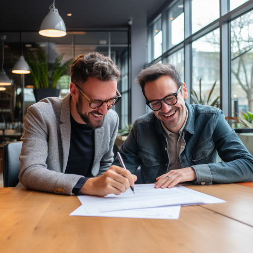 a young man shaking his proteine shake in the gym while next to him there is a robot shaking a cup and there are papers flying out of the cup. make this in an cartoon style