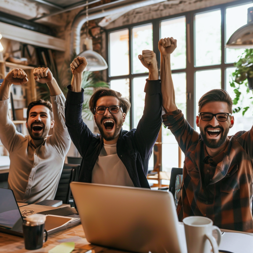 Create a realistic photo of a group of men happy at work, 16:9, office picture --v 6.0