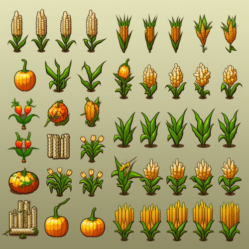 6x16 sprite sheet for farming game with different crops, corn, pumpkin, wheat