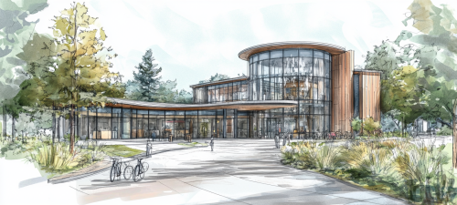 Panoramic design sketch standing within the entry plaza of a zoo looking towards a 3 story round building combined with a monkey exhibit on the right, on the left side is an open pathway between the large building and a separate bike rental and F&B building, Vancouver-style architecture --ar 20:9