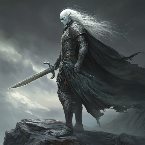 A pale-skinned elf-like figure with gray, almost ghostly skin and long, silver hair, clad in worn, dark plate armor etched with faint shadowy runes. His eyes glow softly with an eerie light, and dark wisps of shadow magic trail from his figure. He wields a tarnished sword and shield, the blade flickering with subtle dark energy. His gaunt, sharp features give him an ethereal and haunting look, standing on a rocky cliff beneath a stormy, overcast sky. Shadows cling to him like mist, hinting at his connection to the Shadowfell, but his stance is that of a disciplined and battle-worn paladin.