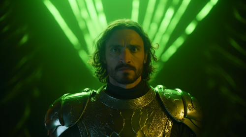 a bright godly man without wings in shining green armour in the center of a screen with a sword in australia ready to destroy its enemies head and upperbody shot focus 4k hide face with light --ar 16:9 --s 50