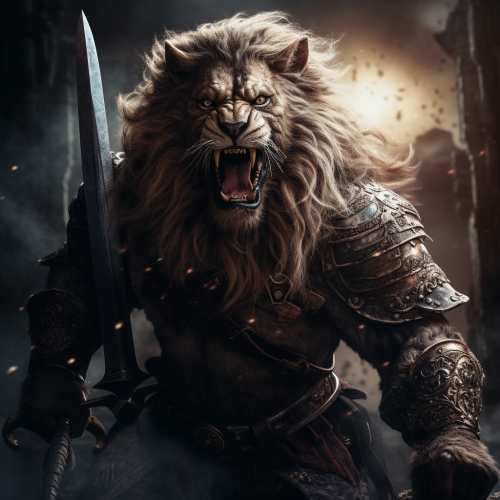 A heroic anthropogenic Lion barbarian roaring at enemies and holding a large battleaxe. He is wearing rough leather armour and stands in a heroic pose. Dramatic lighting on a battlefield.