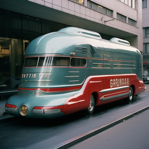a photo of a GM Futurliner with the japanese word for robot painted on the side