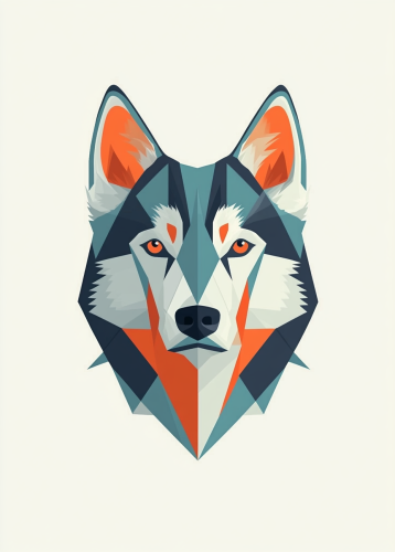 Vector flat illustration of a huskie head, in a simple minimalistic style with geometric shapes and lines, on a light background. The digital art features contrasting shadows, a color scheme in shades of dark blue and orange, and a symmetrical composition with a retro design style. There are no shading details, and it is a vector graphic. --ar 23:32 --v 6.1