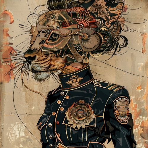"A fashion illustration featuring a stylized woman's body with a giraffe head, wearing a denim puffer jacket and a denim skirt."--ar 4:5