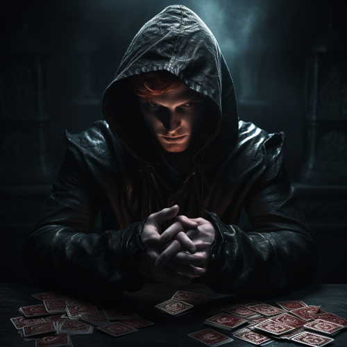 a cocky red-headed nerdy guy, wearing a mage robe and hood, menacing looking over a hand full of fanned out playing cards in a dark ominous dungeon, 4k, hyper-realistic