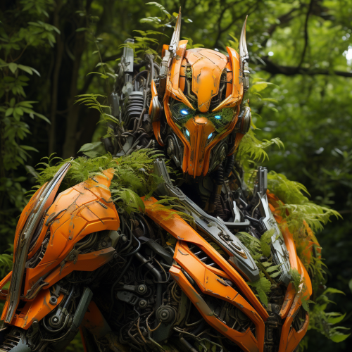 Un transformers vert et orange, 3D, arbres et foret, riviere, Hyper Realistic