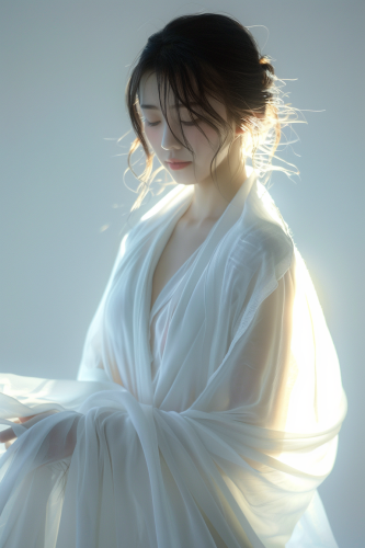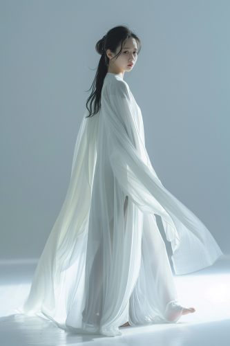 Full-body 4K photorealistic image of a Japanese girl in a long, flowing white chiffon cardigan, standing with a serene expression. Soft white light envelops her, adding a delicate glow, with subtle shadows creating depth. Background softly blurred, enhancing the focus on her and the garment. Canon EOS R5, hd quality, editorial style --ar 2:3 --v 6.0