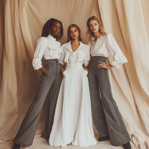3 models full body wearing studded grey denim in style of ulla johnson wide leg style with white chiffon shirts top button open in the style of chloe on a neutral background for fall season