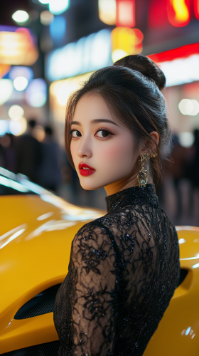 A close-up of a young Japanese woman’s face, her hair styled in a chic bun with a stylish hairpin. She is dressed in a sleek black evening gown, looking glamorous as she stands next to a striking yellow Ferrari F8 Tributo parked outside a trendy nightclub. Her makeup is bold, with dramatic eyeliner and red lipstick that highlight her features. The background captures the vibrant nightlife, with soft lights and silhouettes of people enjoying the evening. Photorealistic, highly detailed, 8K resolution --ar 9:16 --v 6.1 --style raw