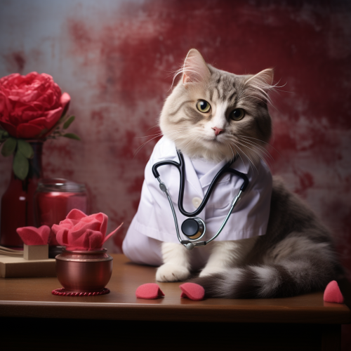 Miyazaki style Cheshire Cat queen and king characters dancing together in elegant grand ballroom with whimsical red balloon hearts float surrounding them.
