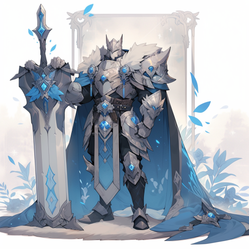 A blue and gold armor with white floral patterns, fantasy-style artwork, white background, detailed character illustrations, texture-rich canvases, strong lighting contrasts, playful character design, isolated on a white background. --ar 115:128 --niji 6