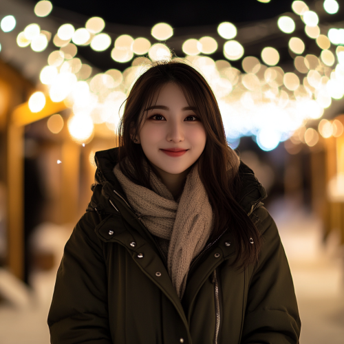 Upper body shot, Portrait, front view, hyper realistic, winter, night, snowy, korean Solo, Bright lights, warm colors, Nordic country style town, fairytale atmosphere, wide square, festival, Christmas season, happy Korean woman standing diagonally and smiling at camera, Canon EOS R5 with a 200mm lens, --style raw --v 6.1 --ar 1:1