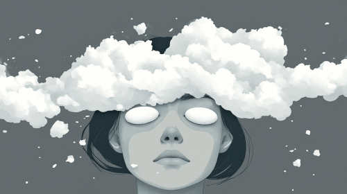 a abstract woman's head is covered in snow, with three white cotton pads on the forehead and face, in a flat illustration style, against a gray background. White clouds float in front of his eyes, with lines, smooth curves, and geometric shapes in a black drawing, in a minimalist design. The image has a clean, white space at the top --ar 16:9