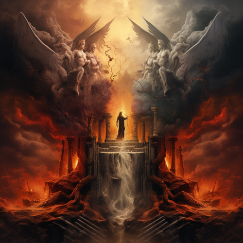 hell on the left with grim reaper, skeletons and fire, and in the middle an infinity figure 8 loop, on the right heaven with angels, light, love, eternal life. 4k, hyper realistic.