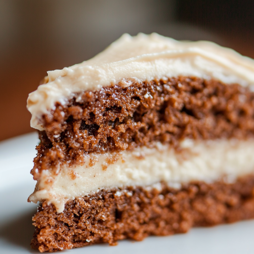 A close-up of a slice of moist Applesauce Cake with a creamy vanilla frosting layer on top. The cake has a rich, brown color with a slightly crumbly texture, showing hints of cinnamon and spices. The frosting is smooth and slightly glossy, adding a creamy contrast to the cake. Warm, soft lighting highlights the cake's texture and the delicate shine of the frosting. The cake slice is placed on a simple white plate, with the focus on the layers and inviting appearance of the dessert.