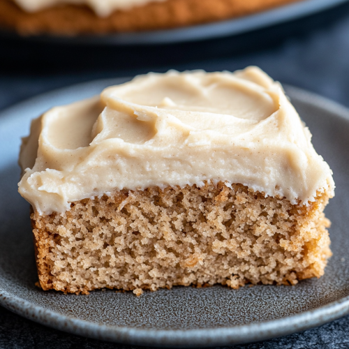 Close-up photograph of a moist 'Applesauce Cake' slice topped with a thick layer of creamy frosting. The cake has a rich, spiced brown color with a soft, fluffy texture, showcasing a slightly crumbly yet moist crumb structure. The frosting is smooth, light, and generously spread over the top, with a slight gloss that enhances its creamy appearance. The edges of the cake have a caramelized look, suggesting a subtle sweetness and depth of flavor from the applesauce and spices. A transparent overlay at the top reads 'Applesauce Cake' in bold, rustic font. The lighting is soft and warm, accentuating the cake’s inviting texture and giving it a cozy, homemade appeal. hd quality, food photography style, comforting and classic dessert.