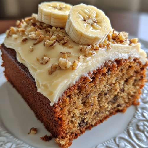 Generate a close-up image of a slice of moist banana bread cake topped with a thick layer of creamy frosting. The cake slice should show a rich, golden-brown color with specks of banana and tiny, evenly distributed pieces of nuts or chocolate for texture. The frosting should be smooth and generously spread on top, with a few fresh banana slices as garnish. Place the cake slice on a white, textured plate to add a homely touch. The background should be softly blurred, with warm lighting to emphasize the moistness and richness of the cake
