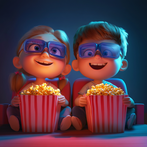 little girl and little boy, 5 years old, watching movie, eating popcorn, wearing 3d effect glasses, pixar style, animation, cartoon, 3d, cute, having fun, plain background