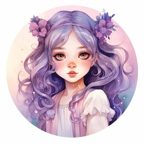 cute little girl in pastel purple, anime style, watercolor, fae circle frame