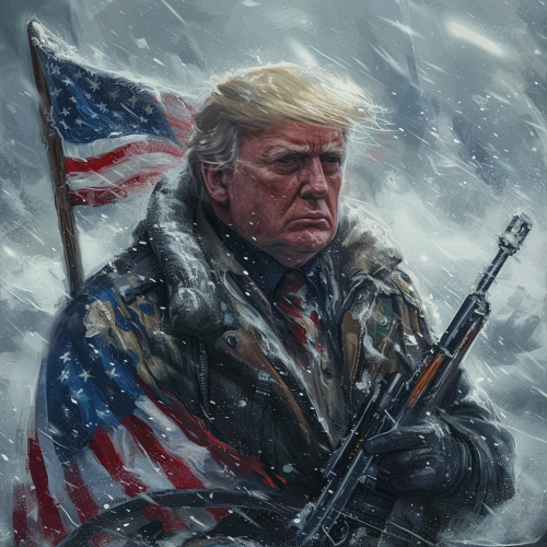 Donald Trump, stern expression, in the Arctic during a storm with nordic onghouse behind him holding an m1 garand and wearing a suit with an American flag design --s 50 --v 6.0