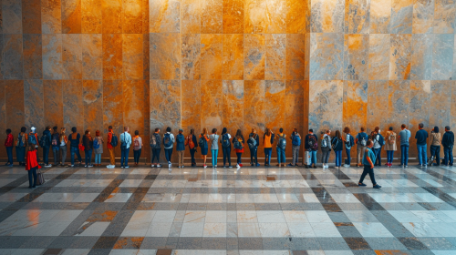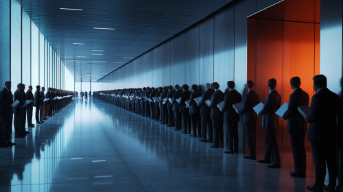 a long interminable line of exhausted office workers carrying heavy documents standing in a cue , inside a modern coridor, 24 mm, realism image, cinematic style , hyper-realistic, highly detailed, daytime scene, atmospheric lighting, rich in detail, photography, high quality, --ar 16:9 --v 6.1