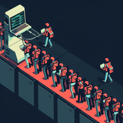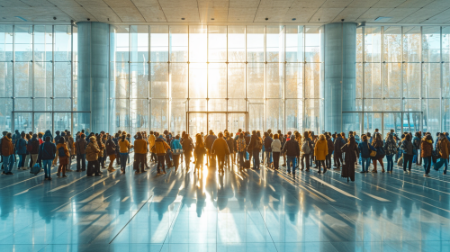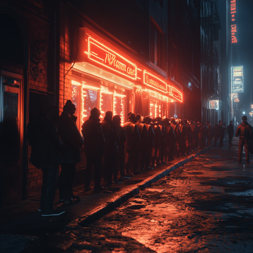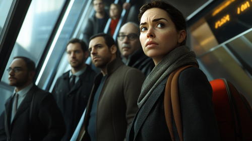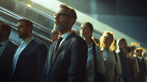 an interminable cue of tired office workers are waiting in line shoulder to shoulder, to go up an escalator, 50 mm, realism image, cinematic style , hyper-realistic, highly detailed, daytime scene, atmospheric lighting, rich in detail, photography, high quality, --ar 16:9 --v 6.1