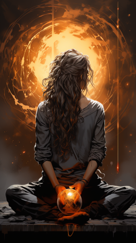 classic drawing line art illustration, black and white, maiden, female, long hair, kneeling looking up at an orb of light, graceful, elegant --ar 9:16 --s 750 --v 5.2